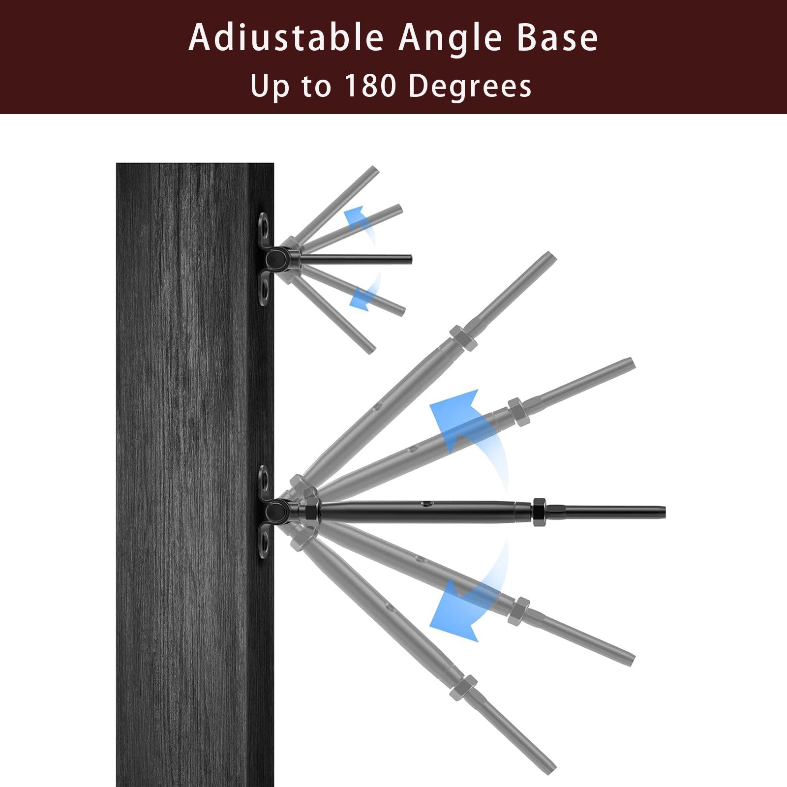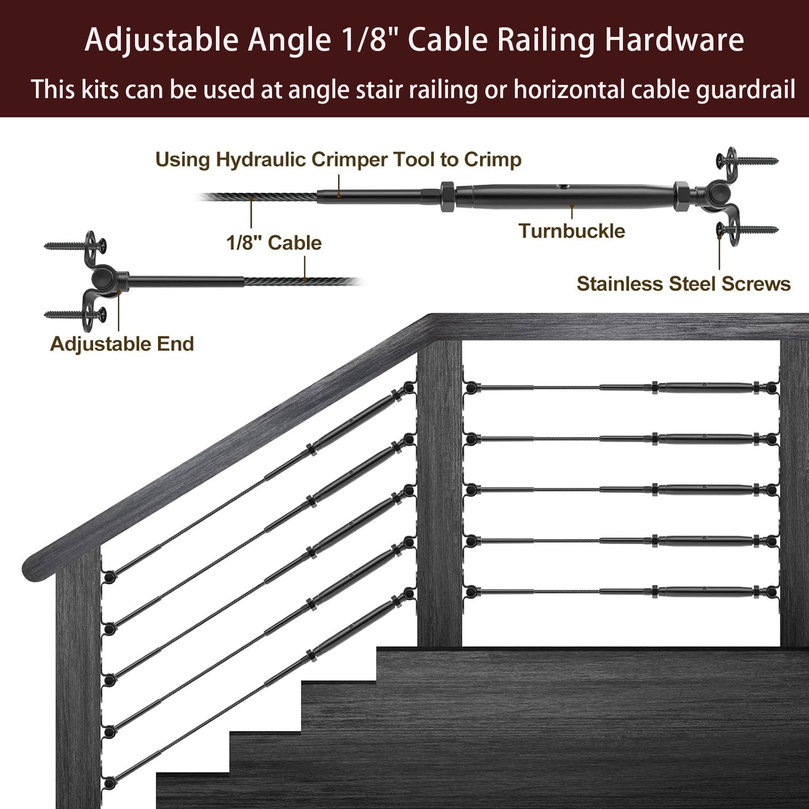 The black adjustable angle cable railing kits are designed for use with 1/8'' stainless steel cable. Featuring a 180° adjustable base, this versatile kit can be used for both angled stair railings and horizontal cable guardrails. Suitable for both indoor and outdoor installations, these black cable railing components are perfect for any project.