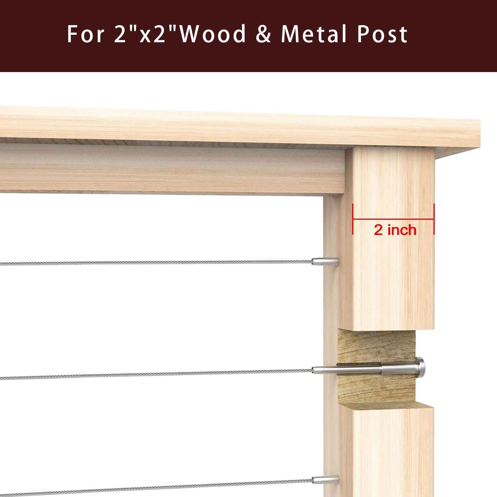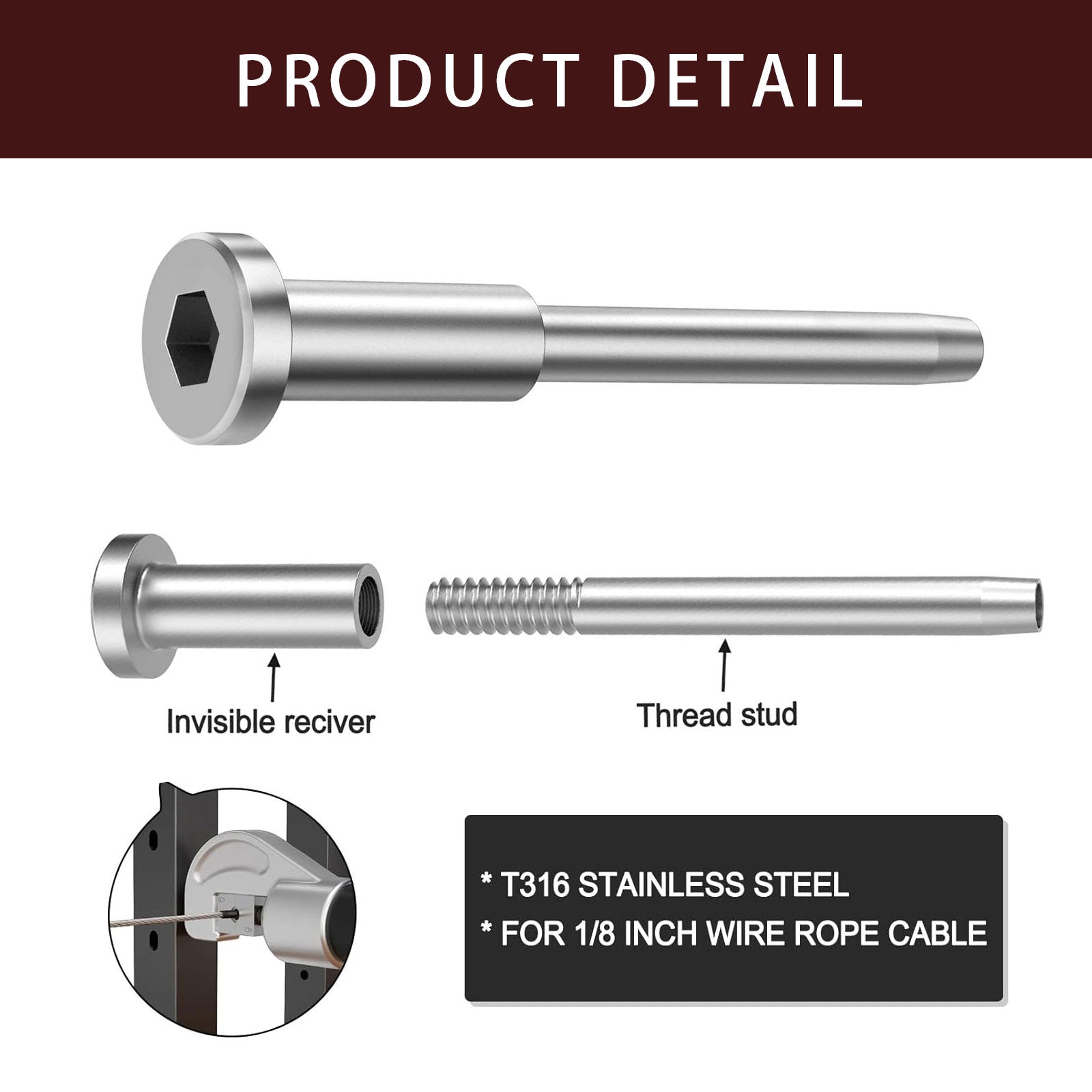 Cablura silver invisible receiver and swage stud end kit is built for 1/8" cable railing systems, compatible with 2"x2" wood or metal posts for level, stair, or angled sections. It creates a clean and secure “dead end” for your railing setup, suitable for decks, balconies, and indoor railings.